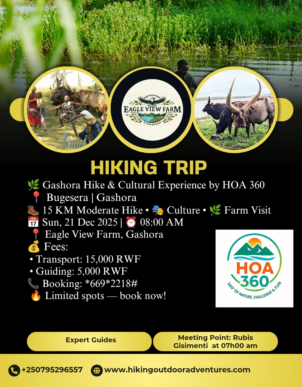 πΏ Gashora Hike & Cultural Experience by HOA 360 π Bugesera | Gashora π₯Ύ 15 KM Moderate Hike β’ π Culture β’ πΏ Farm Visit π Sun, 21 Dec 2025 | β° 08:00 AM π Eagle View Farm, Gashora π° Fees: β’ Transport: 15,000 RWF β’ Guiding: 5,000 RWF π Booking: *669*2218#