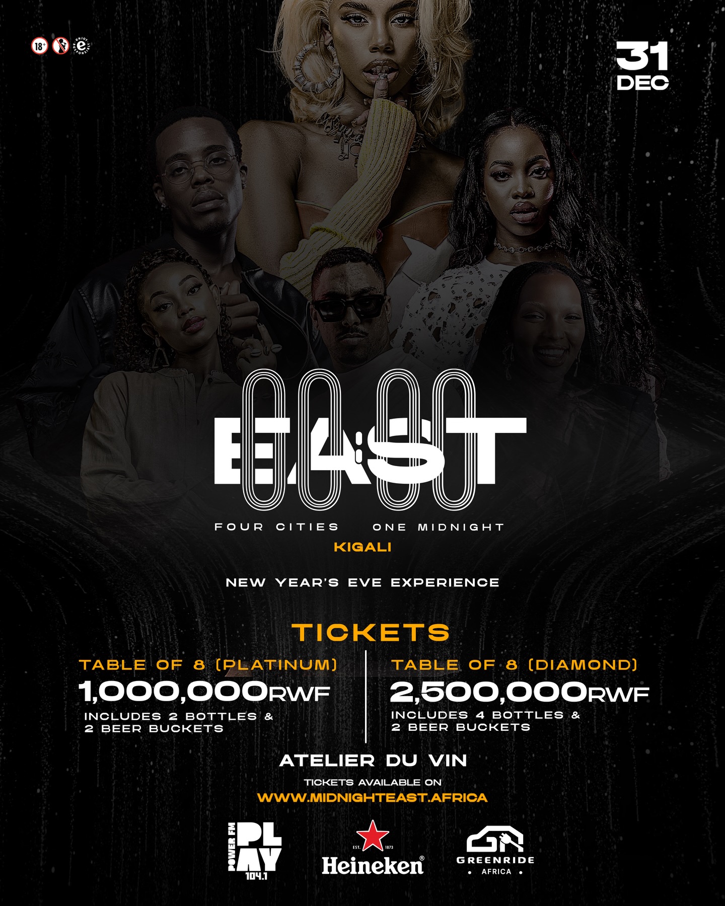 Kigali, welcome to a new way of counting down.Midnight East brings together four cities for one massive New Year’s Eve experience—connected through music, culture, and energy.Dance into 2026 with top international DJs and a curated Kenyan lineup.Grab your ticket and be part of the moment.A New Year’s Eve experience wheremusic, style, and energy meet at midnight.Experience the city of a thousand hills like never before. Kigali brings sophisticated vibes, immaculate production, and an atmosphere that embodies Rwanda's renaissance. Join Africa's cleanest city for its most electric night.Tickets & tables available.www.midnighteast.africa