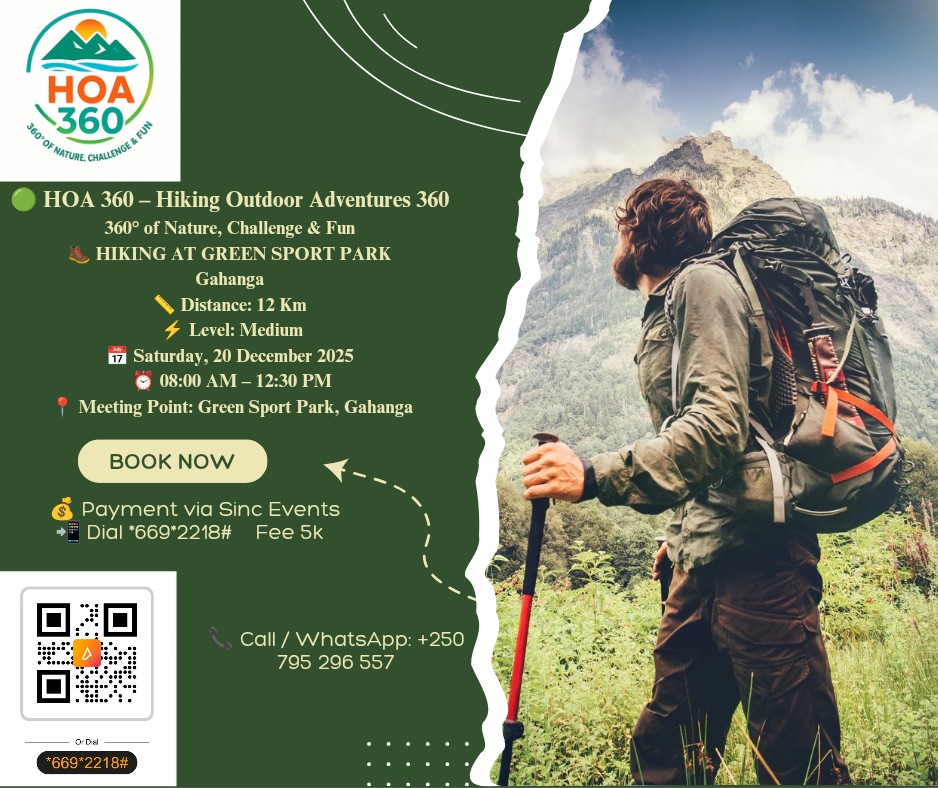 HOA 360 – Hiking Outdoor Adventures 360 360° of Nature, Challenge & Fun ✨️🇷🇼 ♥️ HIKING AT GREEN SPORT PARK Gahanga 🥾 LEVEL: 12 Km • Medium 📅 Saturday, 20 December 2025 ⏰ 08:00 AM – 12:30 PM 📍 Meet / Start: Green Sport Park, Gahanga PAYMENT & BOOKING 💰 Pay via Sinc Events *669*2218# Fee 5k Powered by Sinc Events 📞 Call / WhatsApp: +250 795 296 557 HOA 360 — Adventure • Endurance • Excellence #HOA360 #HikingOutdoorAdventures #GreenSportPark #Gahanga #HikingRwanda #ExploreRwanda #VisitRwanda #OutdoorAdventure #WeekendHike #ActiveLifestyle