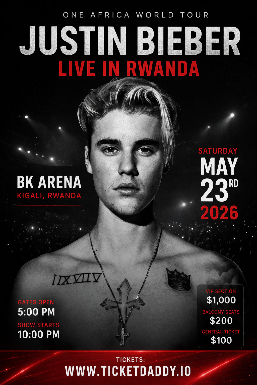 ONE AFRICA WORLD TOUR — JUSTIN BIEBER LIVE IN RWANDA Get ready for a historic night as global superstar Justin Bieber takes the stage in Kigali for an unforgettable live performance. As part of the One Africa World Tour, this landmark event brings one of the world’s biggest artists to the heart of Africa, uniting fans through music, culture, and pure energy. Hosted at BK Arena, this experience will deliver world-class production, electrifying performances, and an atmosphere like never before. From chart-topping hits to iconic moments, this is more than a concert — it’s a cultural milestone. Join thousands of fans from across Africa and beyond for a night that will define the sound of a generation.